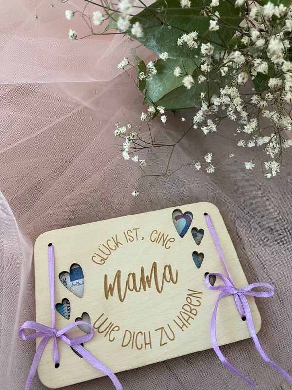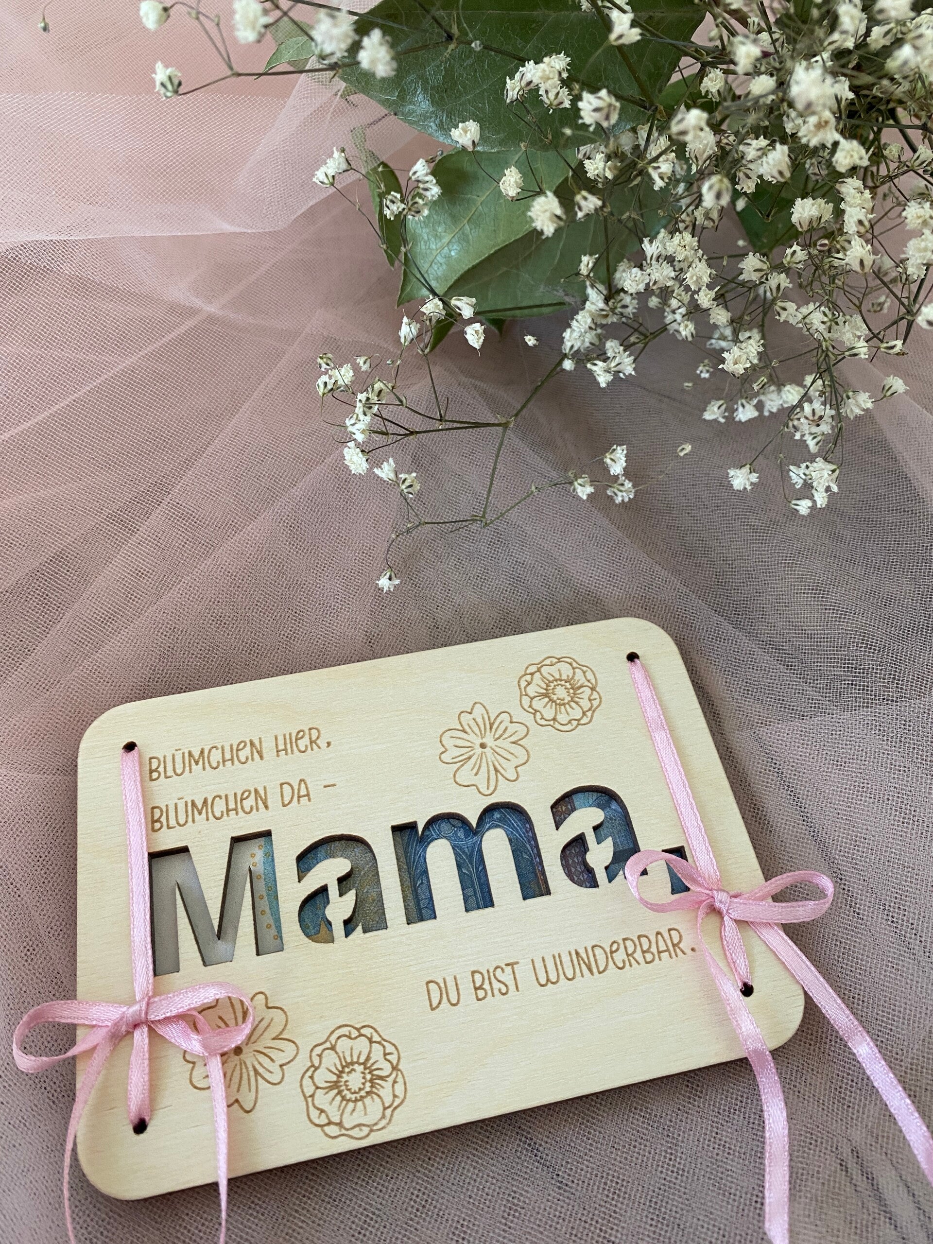 Mit filigranen Blumen, sanften Laserschnitten und Bändern, die je nach Laune und Liebe variieren, wird jede Karte zu einem kleinen Unikat – genau wie deine Mama.