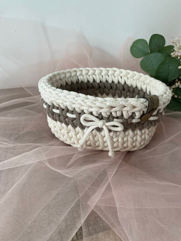 Mit viel Herz und Handarbeit entstand dieses kleine Ordnungswunder in den sanften Naturtönen warm-beige und natural. Die süße Masche vorne ist wie ein kleines Schleifchen fürs Zuhause – dezent, aber charmant. Der robuste Holzboden sorgt dafür, dass das Körbchen nicht wackelt, selbst wenn du es mit Krimskrams vollpackst (wir wissen, was du da alles reinwirfst – kein Urteil!).