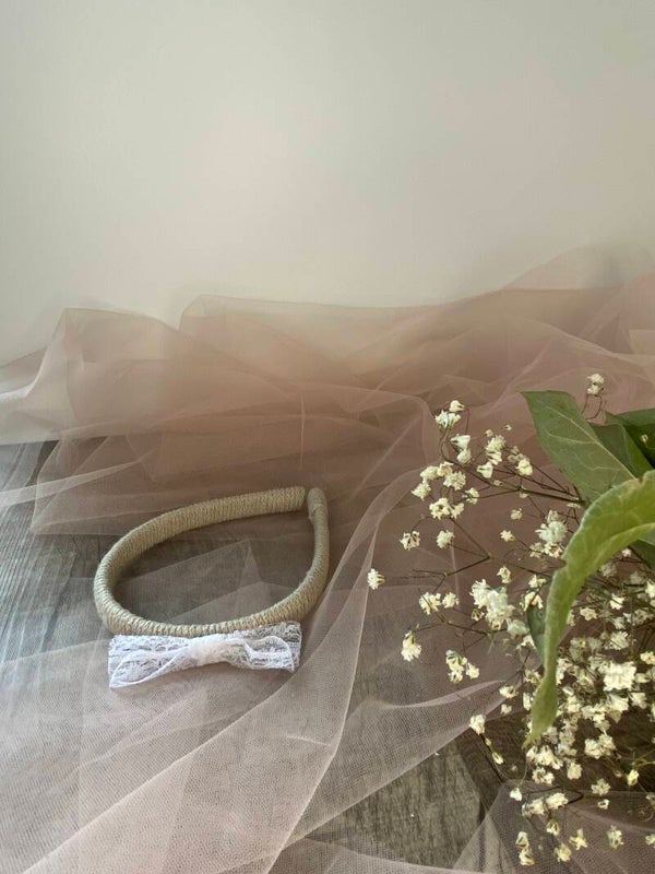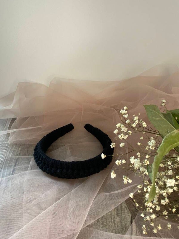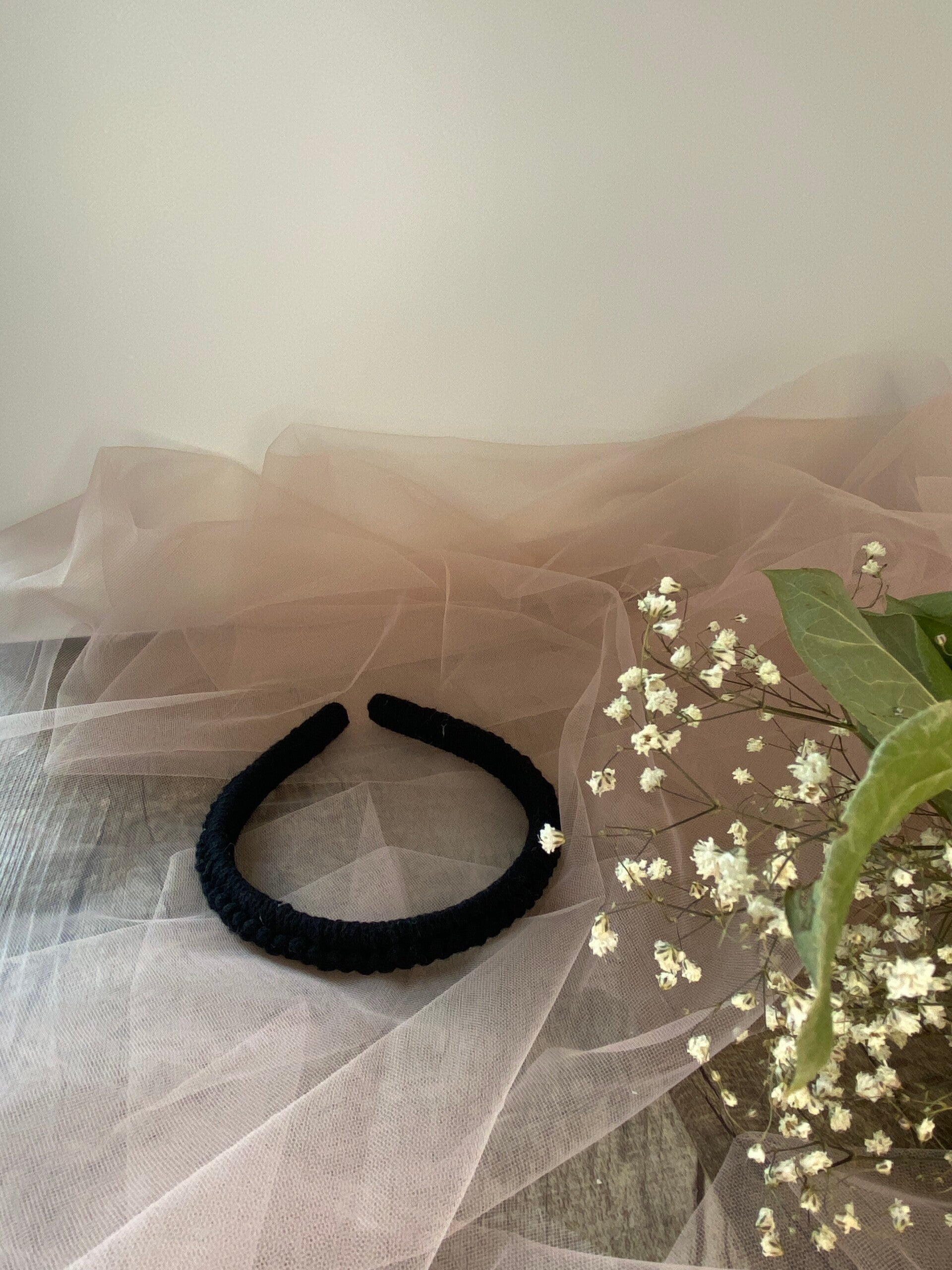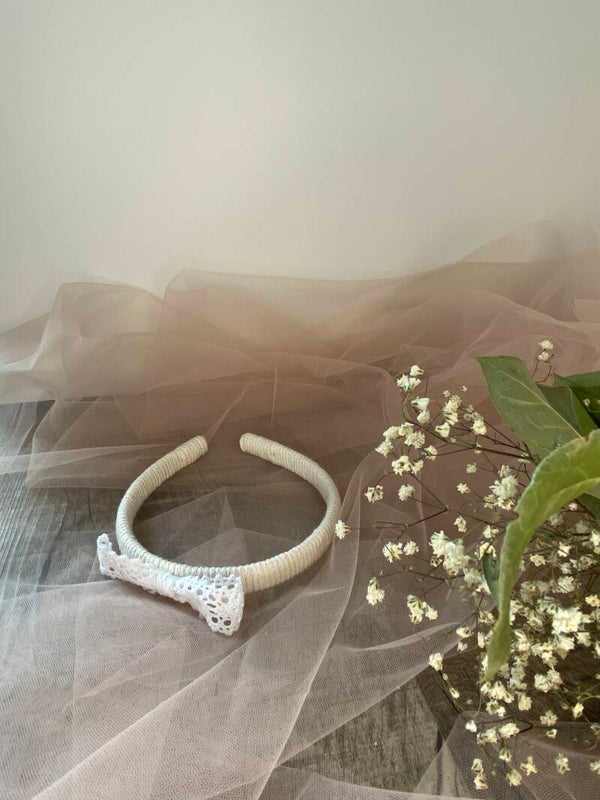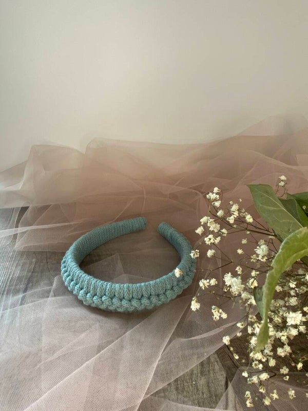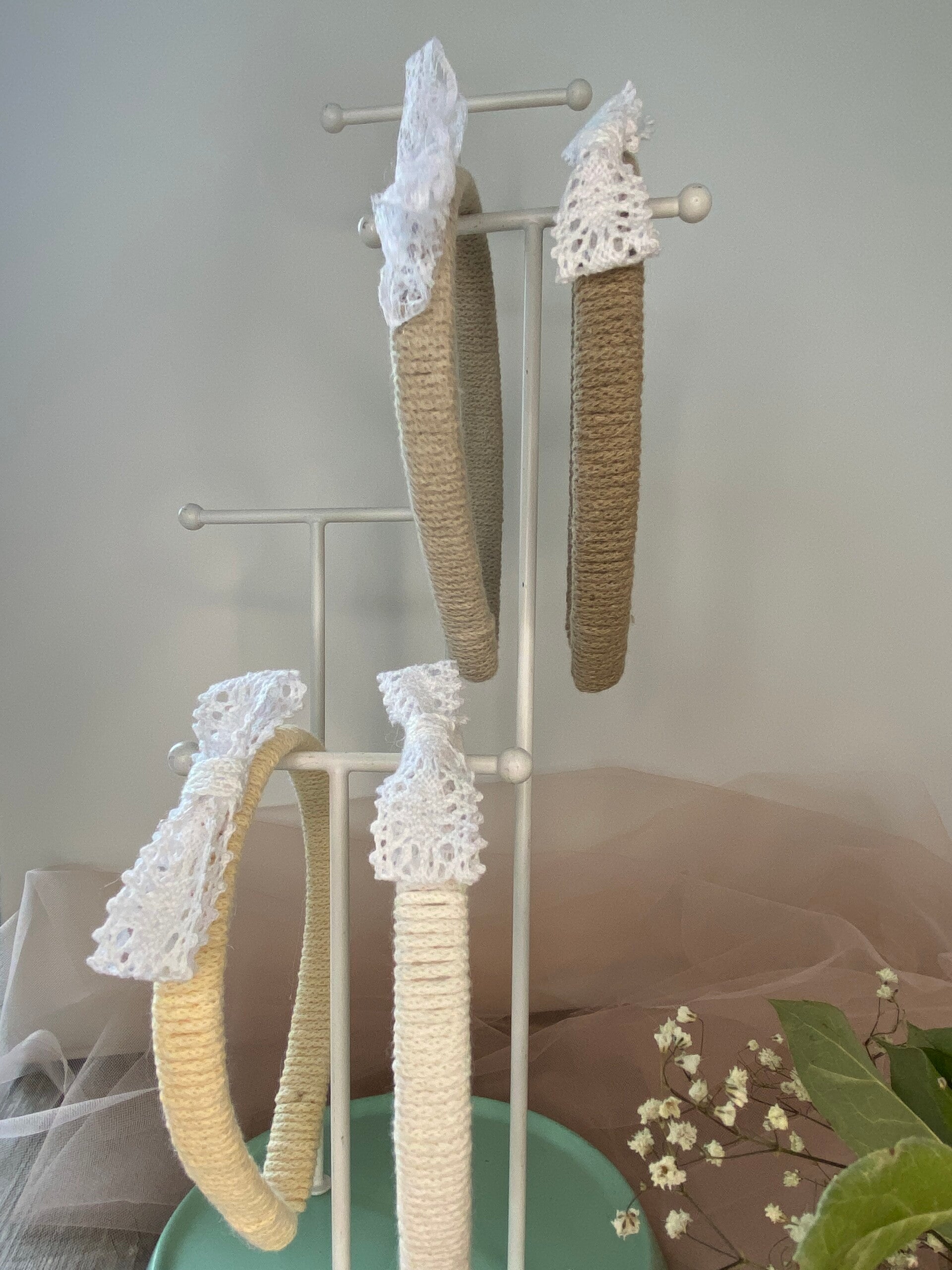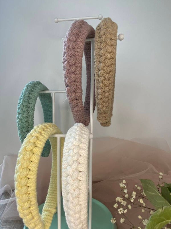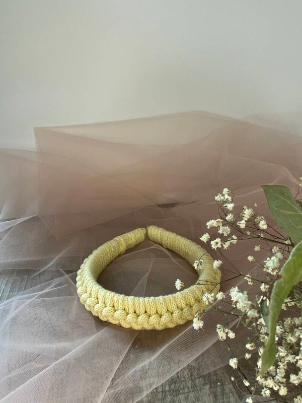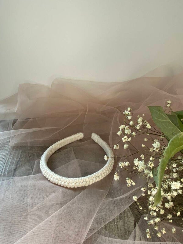 Der Haarreifen besteht aus einem leichten Kunststoff-Rohling , der von Hand mit einem weichen Baumwollgarn in einem kunstvollen Zopfknoten oder glatt umwickelt ist. Du hast die Wahl zwischen zwei verspielten Designs: