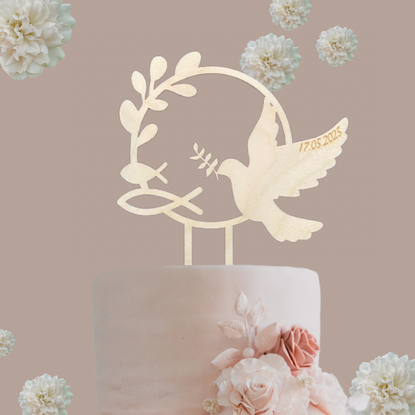 🌿 Cake Topper zur Taufe rund mit Taube & Fischen - personalisiert für eine unvergesslich tolle Torte