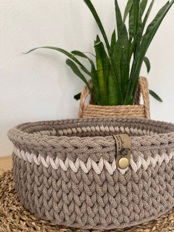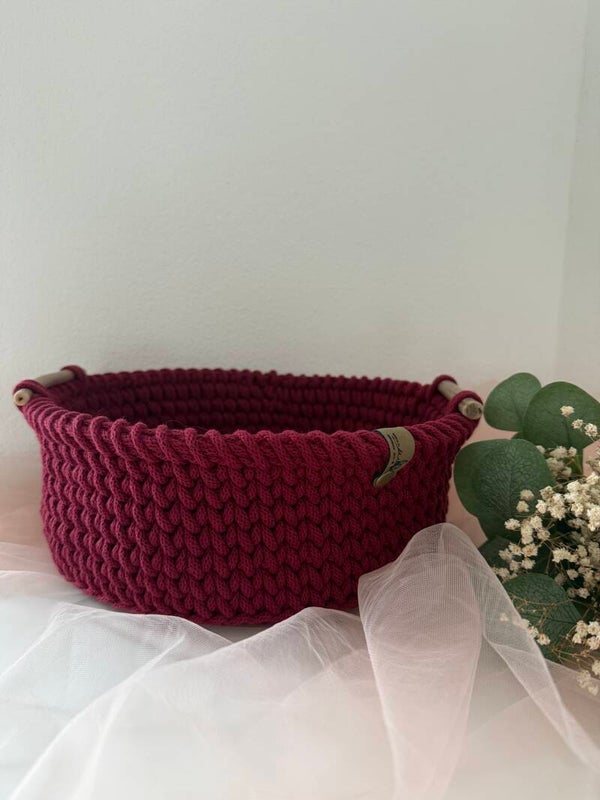 Gefertigt wird jedes Stück von Hand, mit viel Liebe zum Detail. Der Boden besteht aus einem gelaserten Holzbrett, das deinem Körbchen Stabilität verleiht und gleichzeitig für einen charmanten Handmade-Look sorgt. Die Häkelschale wird aus recycelter Baumwolle gehäkelt – weich, formstabil und nachhaltig.