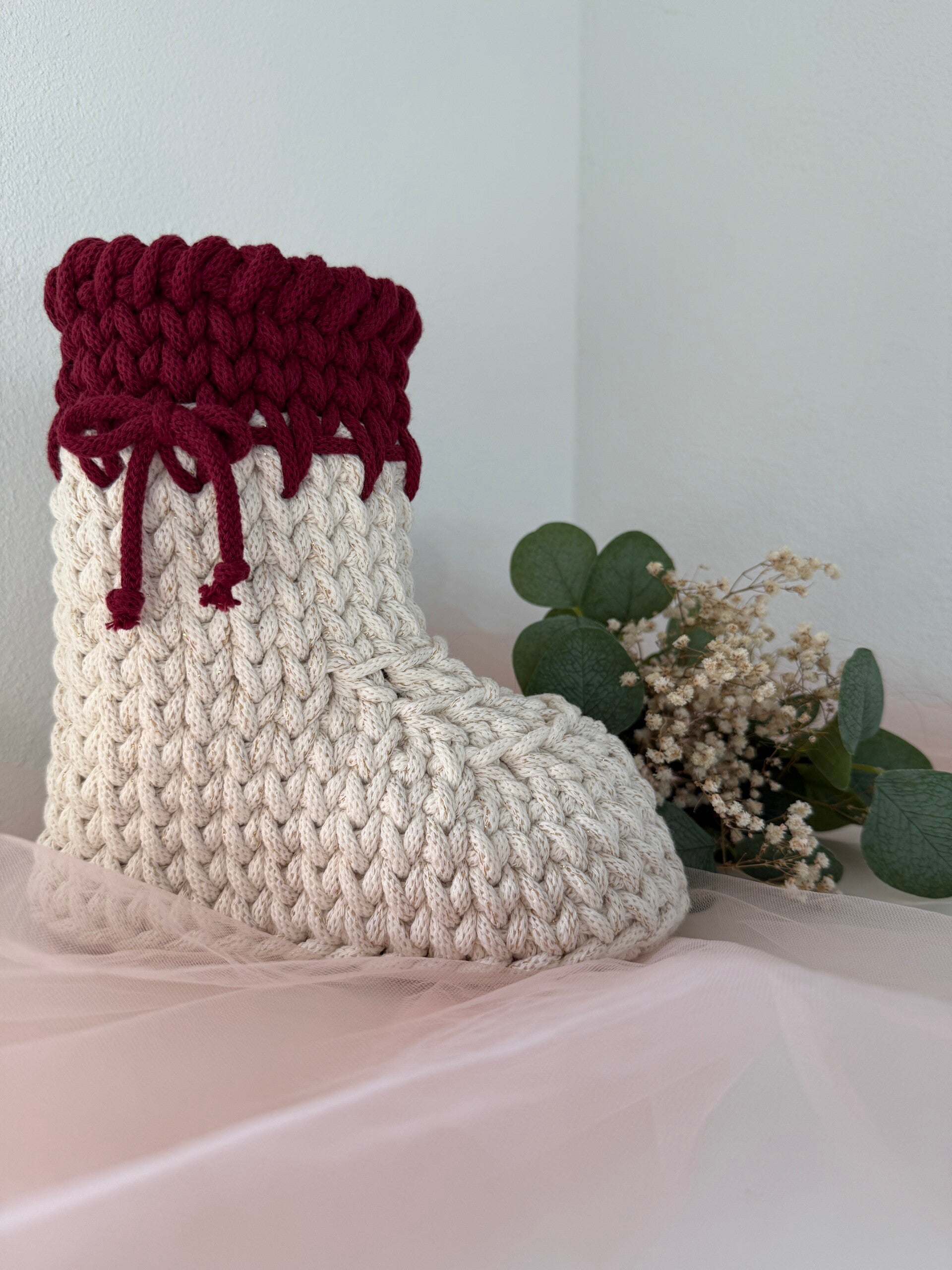 Der hier gezeigte Stiefel kombiniert Natur & Weinrot – klassisch, elegant und zeitlos schön. Natürlich kannst du auch deine ganz persönliche Farbkombination wählen, die zu deiner Weihnachtsdeko passt.