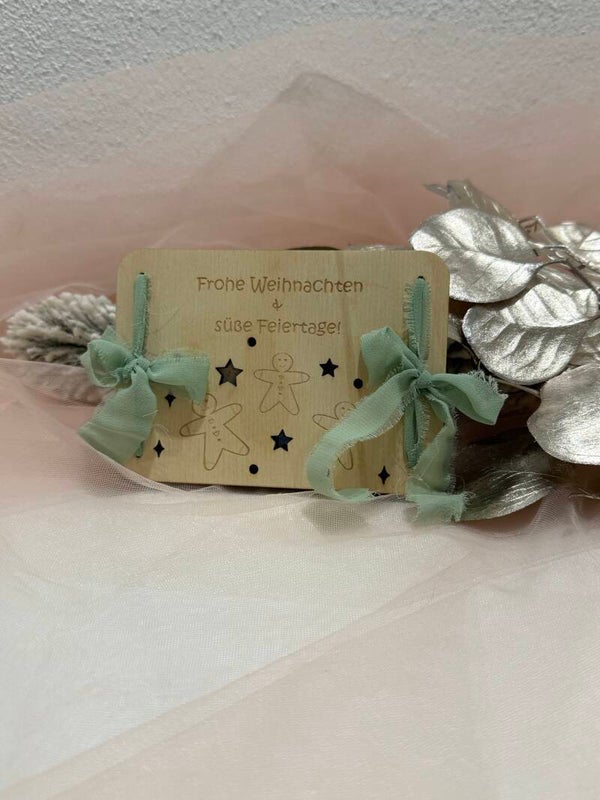 Jede Karte wird aus Holz gelasert, liebevoll veredelt und mit zarten Stoffbändern geschmückt.