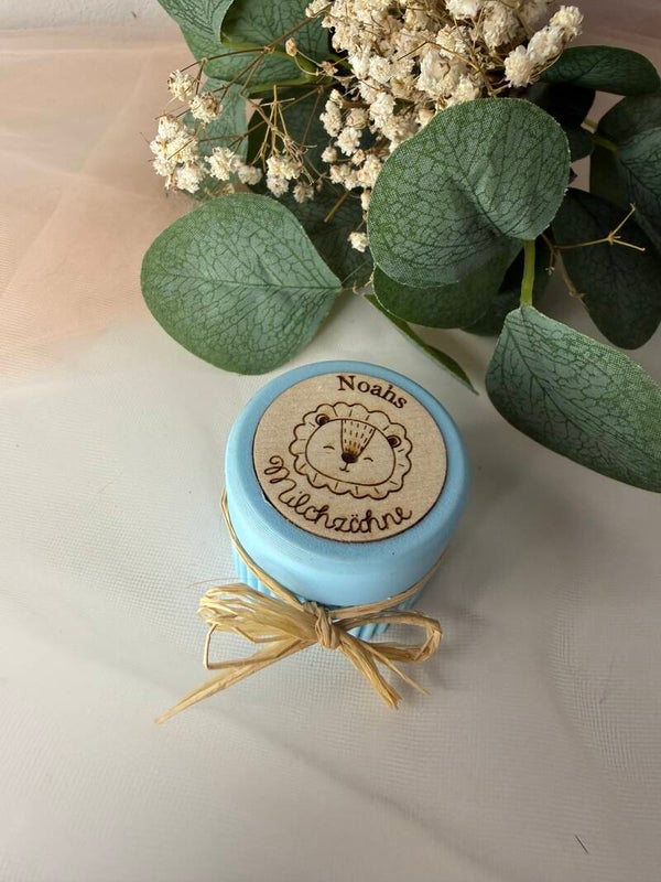 Ob klassisch mit Zahn-Motiv oder Herzchen, oder ganz individuell mit einem Wunschtier oder Regenbogen – du hast die Wahl zwischen verschiedenen liebevoll gestalteten Designs. Jede Dose wird 3D-gedruckt, mit einer Holzscheibe veredelt und danach hochwertig gelasert und mit dem Namen deines Kindes personalisiert – ein echtes Unikat, das Generationen überdauert.